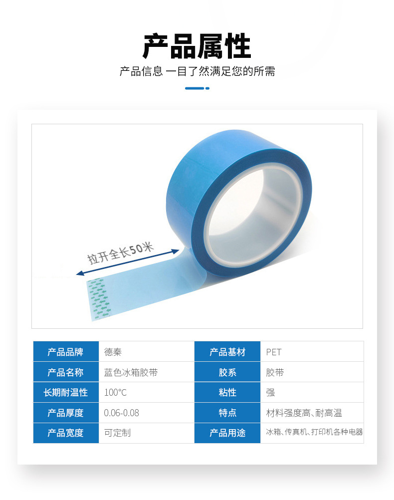 pet蓝色冰箱胶带 打印机空调高粘无痕单面胶带 防火阻燃绝缘胶纸