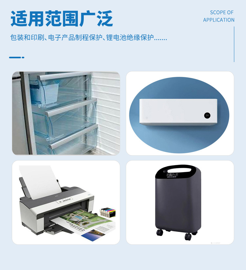 此产品表面经特殊处理,剥离力低,噪声小,粘性强。冷剥,热剥不脱胶的特性。主要用于冰箱、空调、洗衣机、打印机、复印机、传真机等活动部件的固定。冰箱部件发泡时粘贴使用。
